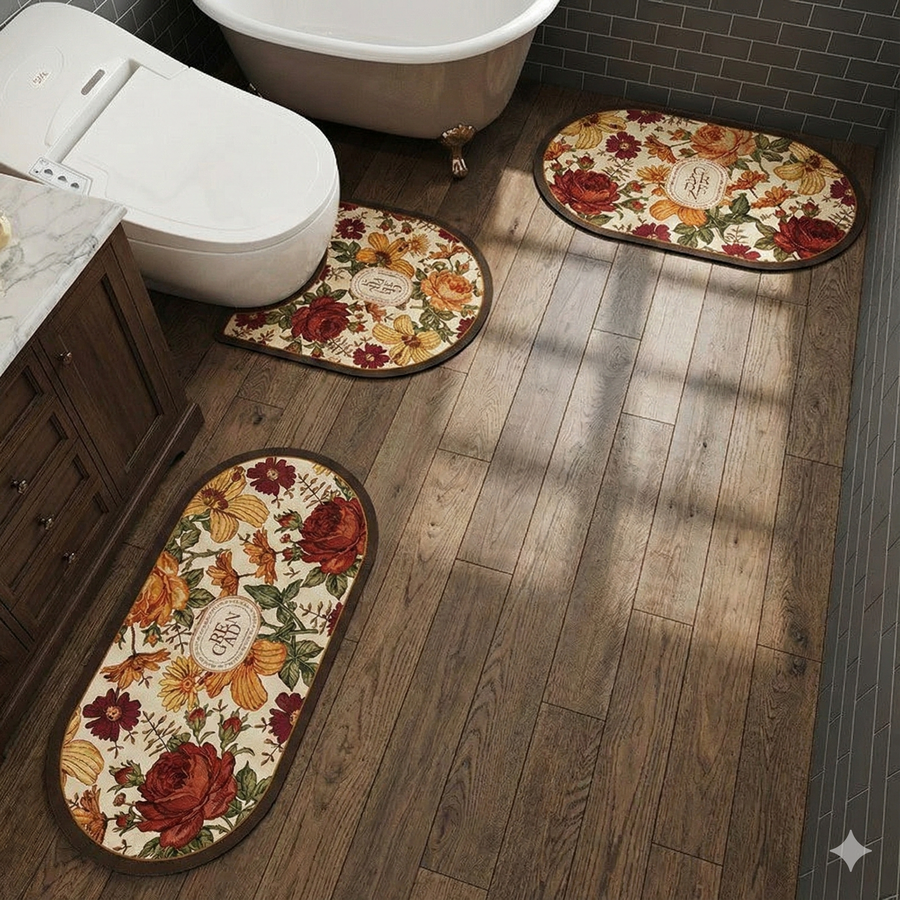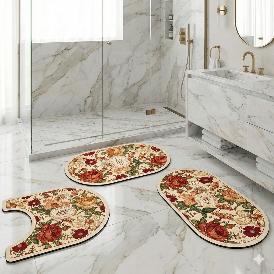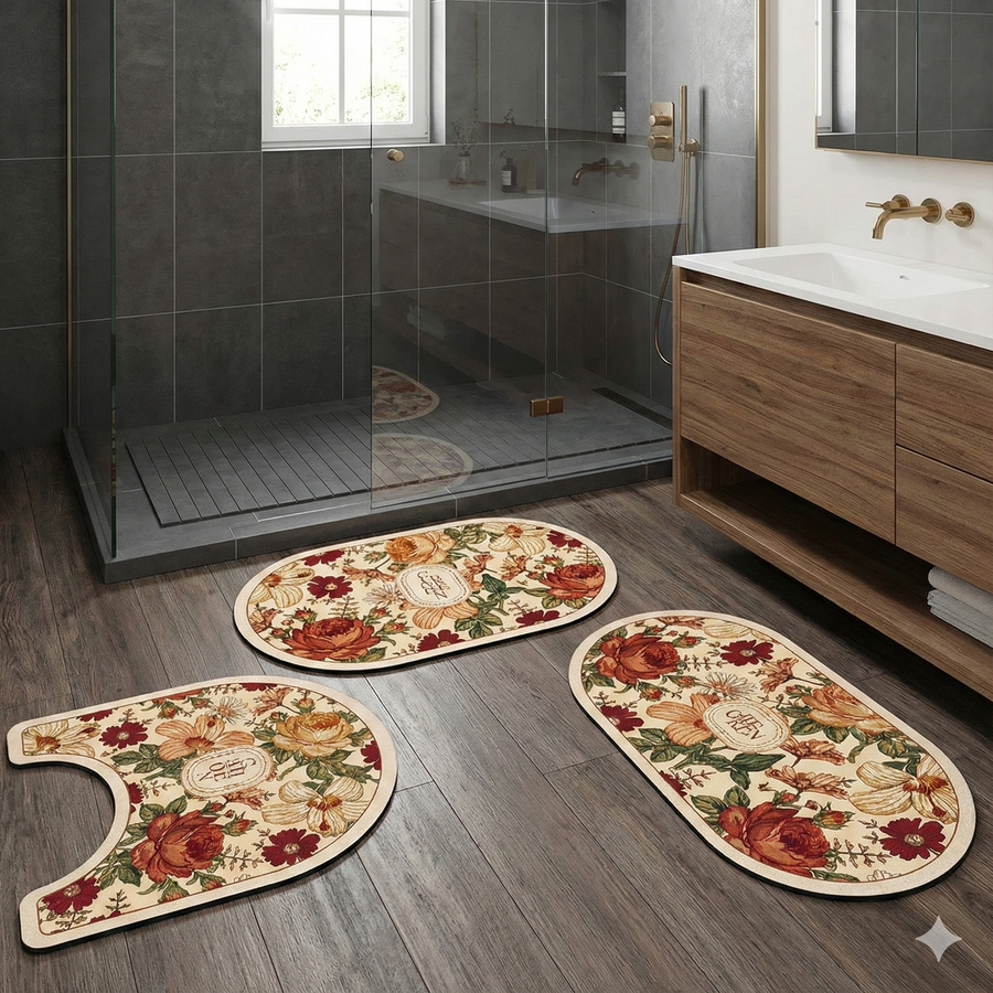 ✅ الطقم مكوّن من 3 قطع متناسقة لتغطية الأرضية بالكامل وحماية الحمام من البلل والبقع